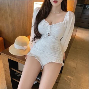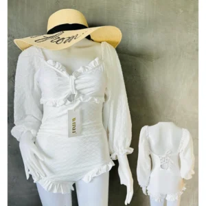 ชุดว่ายน้ำ 2 ชิ้น : เสื้อแขนยาวพอง + กางเกงขาสั้นเอวสูง