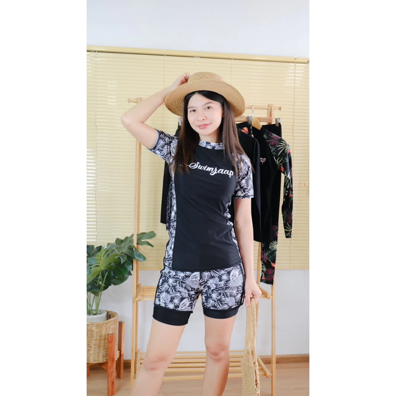 A010 ชุดว่ายน้ำสปอร์แขนสั้น ขาสั้น ลายสีขาว