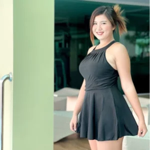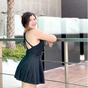 👗 SK02 ชุดว่ายน้ำกระโปรงวันพีซสีดำ ด้านหลังเป็นเส้นไขว้